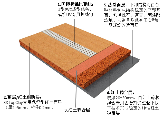 1.全年室外、室内全天候频繁使用 无阶梯凸凹坑孔 2.精确的球反射和优秀的滑步性能 自动保湿免洒水 3.极佳的水渗透性(雨停即用) 4.也适合多功能运动和轮椅网球 5.无需辊压维护,无需帆布遮覆保护 几乎无需维护(正常扫线拖网) 防寒防冻比赛线 6.可实现快速安装 7.所有维护工作可由俱乐部/场地管理员进 行(无需特殊的机器和技术) 8.红土场意外损坏容易修复 9.可直接安装在现有的人造草皮、沥青和 丙烯酸硬地球场上 10.磨损少,使用寿命长(25~30年),无 需大修 |